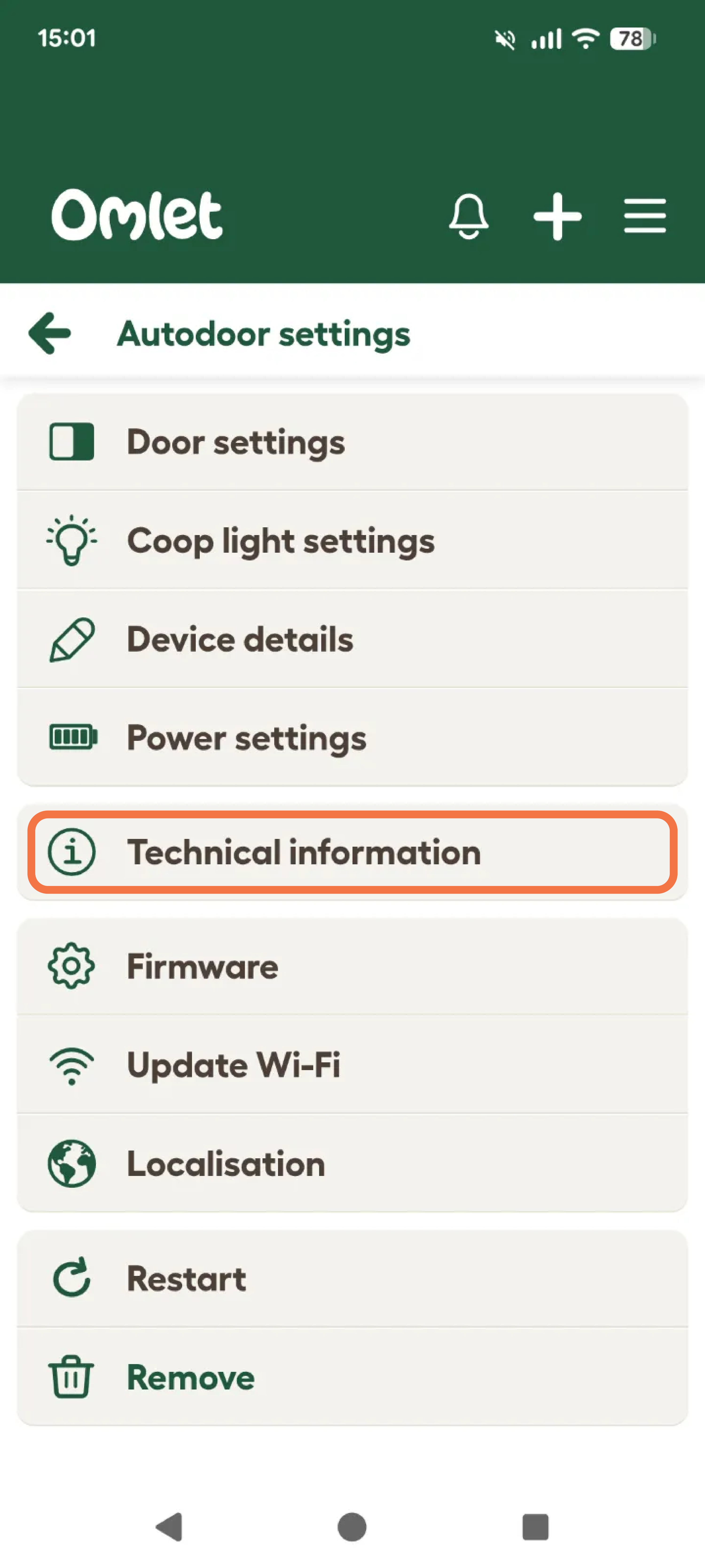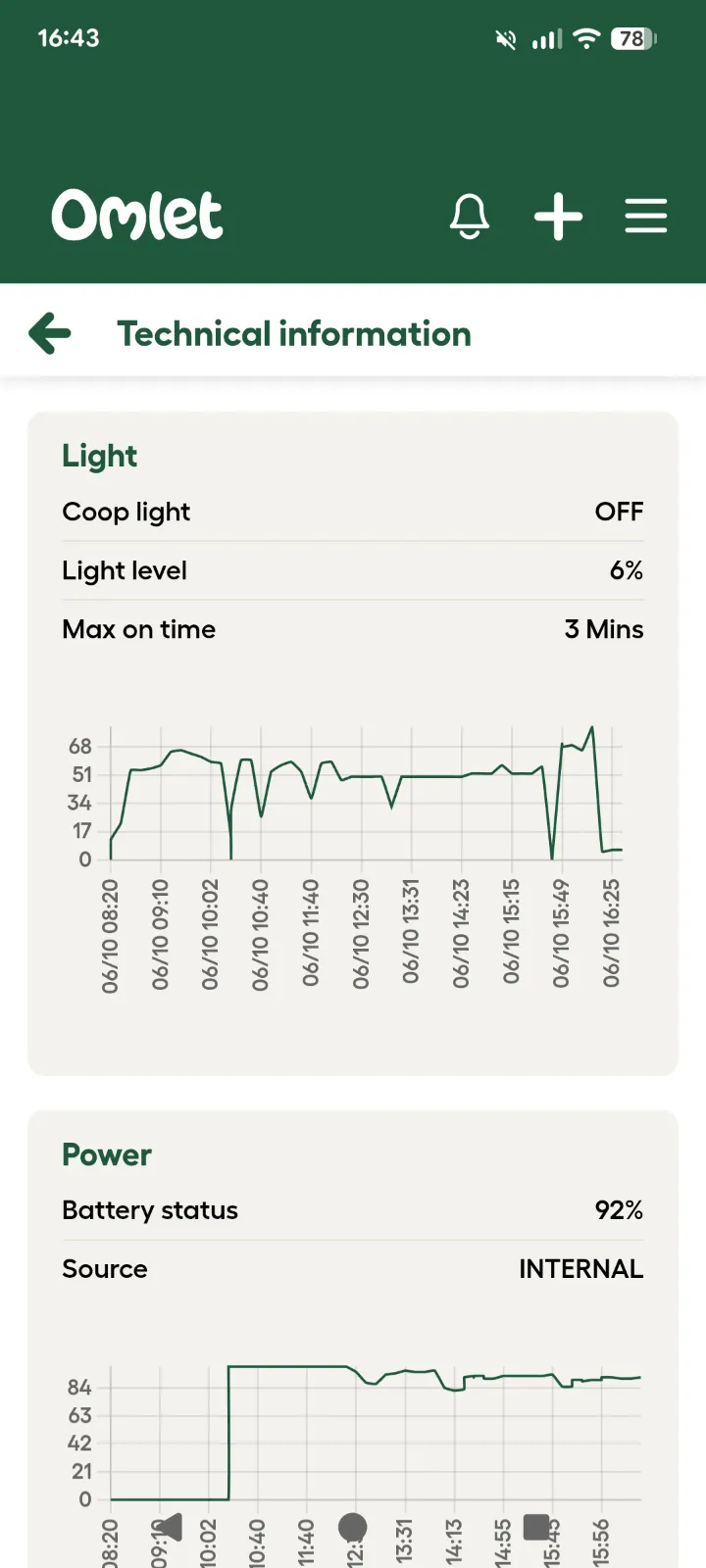 If you would like to review your historical light readings, you can find them in the Omlet App. Go to “Technical Information” and scroll down to the Light section. You can click on the graph to make it bigger, and scroll sideways on the graph to see more information.