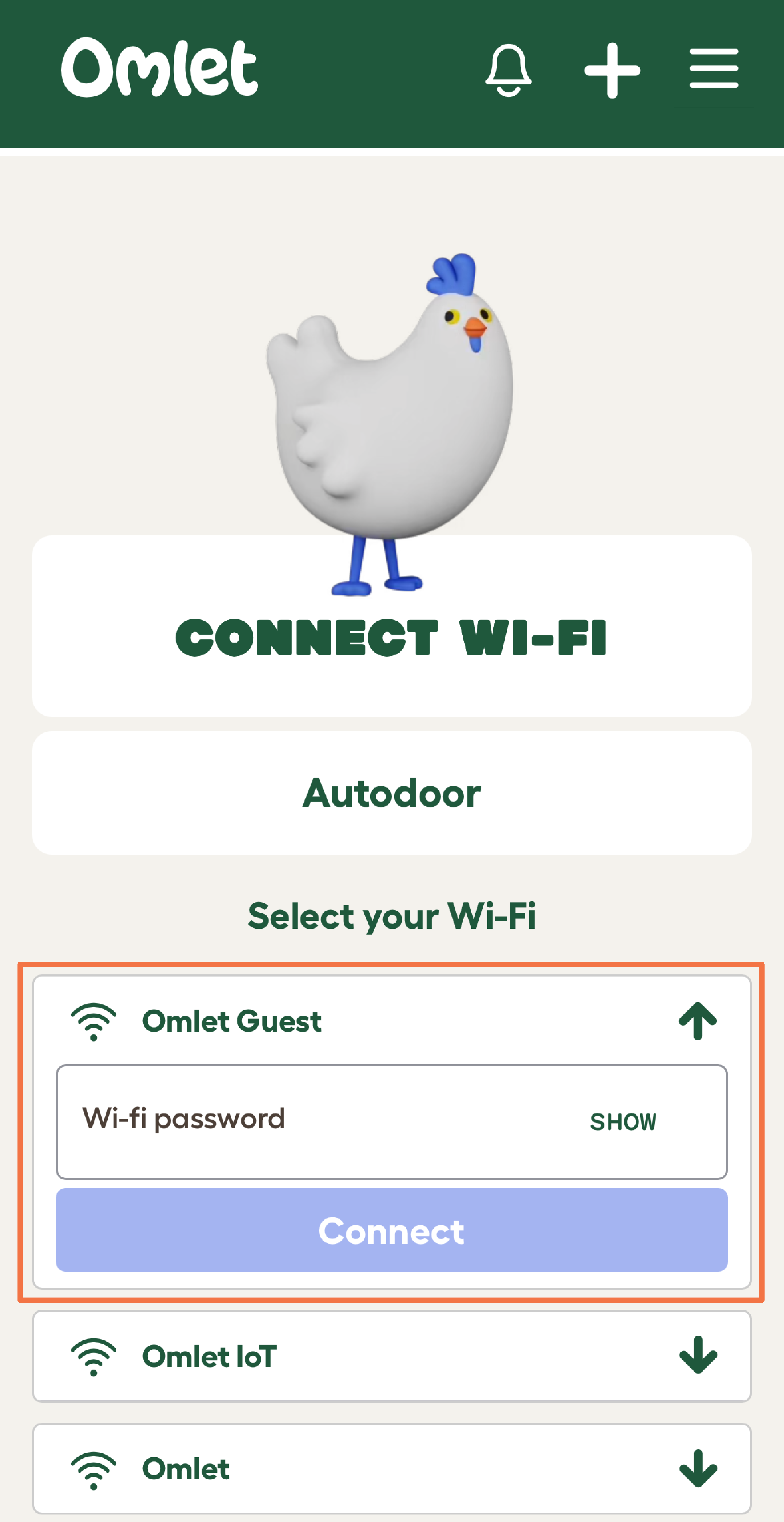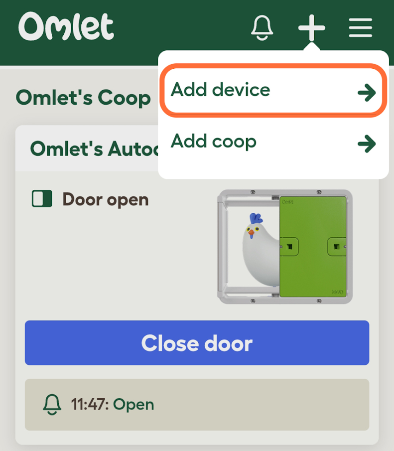 Open the Omlet App and log into your Omlet account. If you don’t have an Omlet account, you can register within the app.
