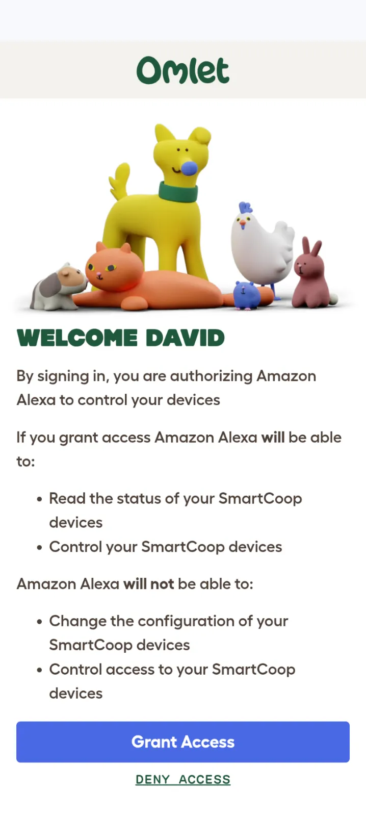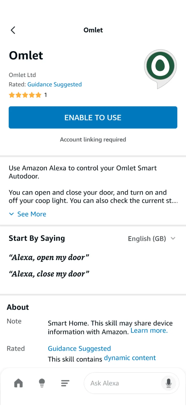 You can use the Omlet Autodoor with Amazon Alexa. You can use voice commands or the Amazon Alexa app. Follow the guide below to link Alexa to your Omlet account.