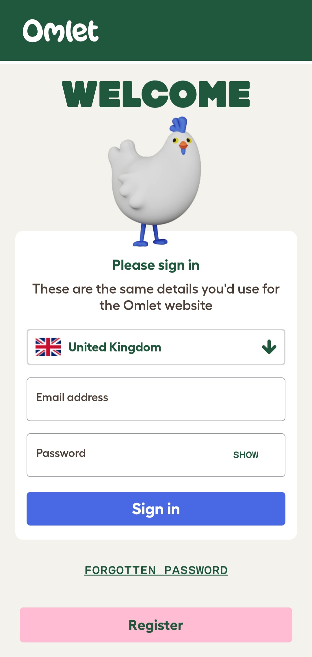 Si c’est la première fois que vous utilisez l’application Omlet, veuillez vous inscrire.