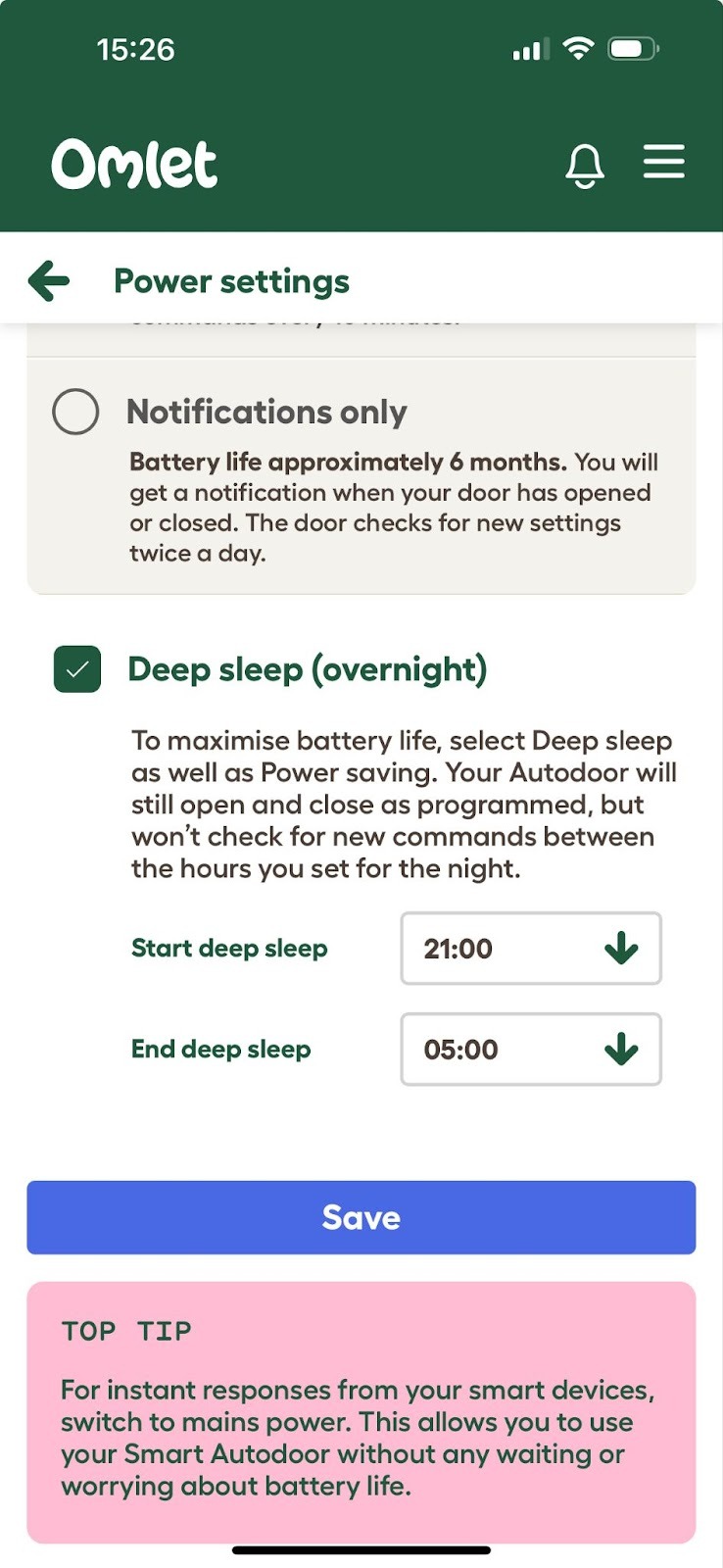 Battery life in this mode is approximately 2–3 months. This mode allows you to control the Autodoor, which checks for commands every 10 minutes. In this mode, you can further optimise the battery life further by using overnight Deep Sleep. Your Autodoor will open and close as programmed but won’t check for new commands between the hours you set at night.